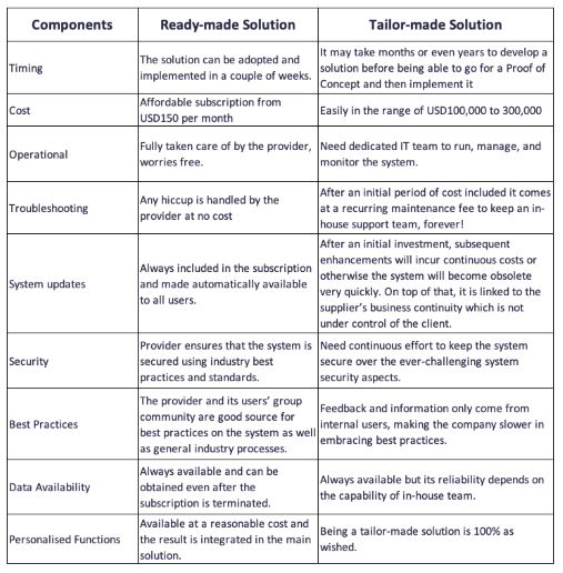 This is why, from a business point of view, it is highly advisable to use, after proper selection, available solutions. As well as Facility Management is business for facility managers, develop FM digital solutions is business for software developers. Below is a simple compare and contrast table to help in deciding if to adopt a ready-made or having a tailor-made solution.